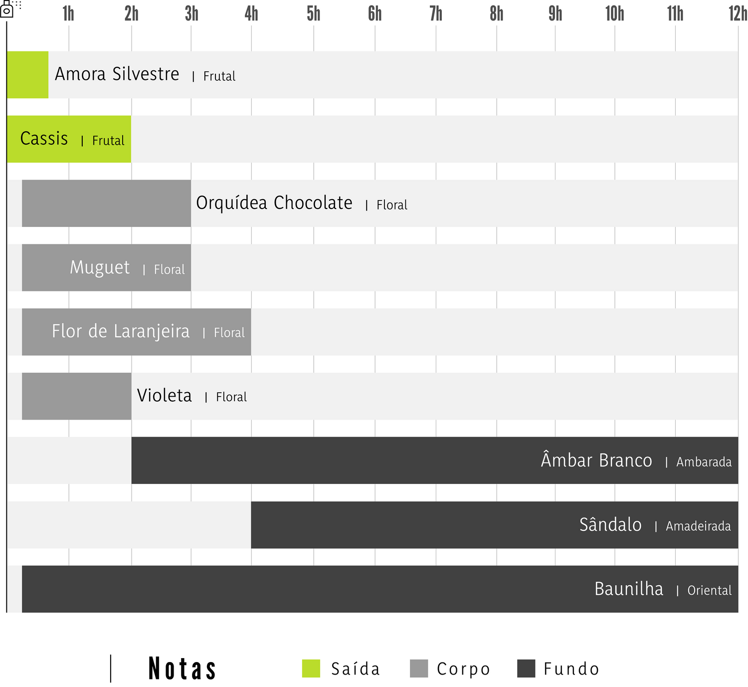 Com o radar olfativo Amyi você pode acompanhar o momento inicial e o tempo de duração mais evidente de cada nota do seu perfume preferido. Veja, por exemplo, a evolução do perfume Amyi V: