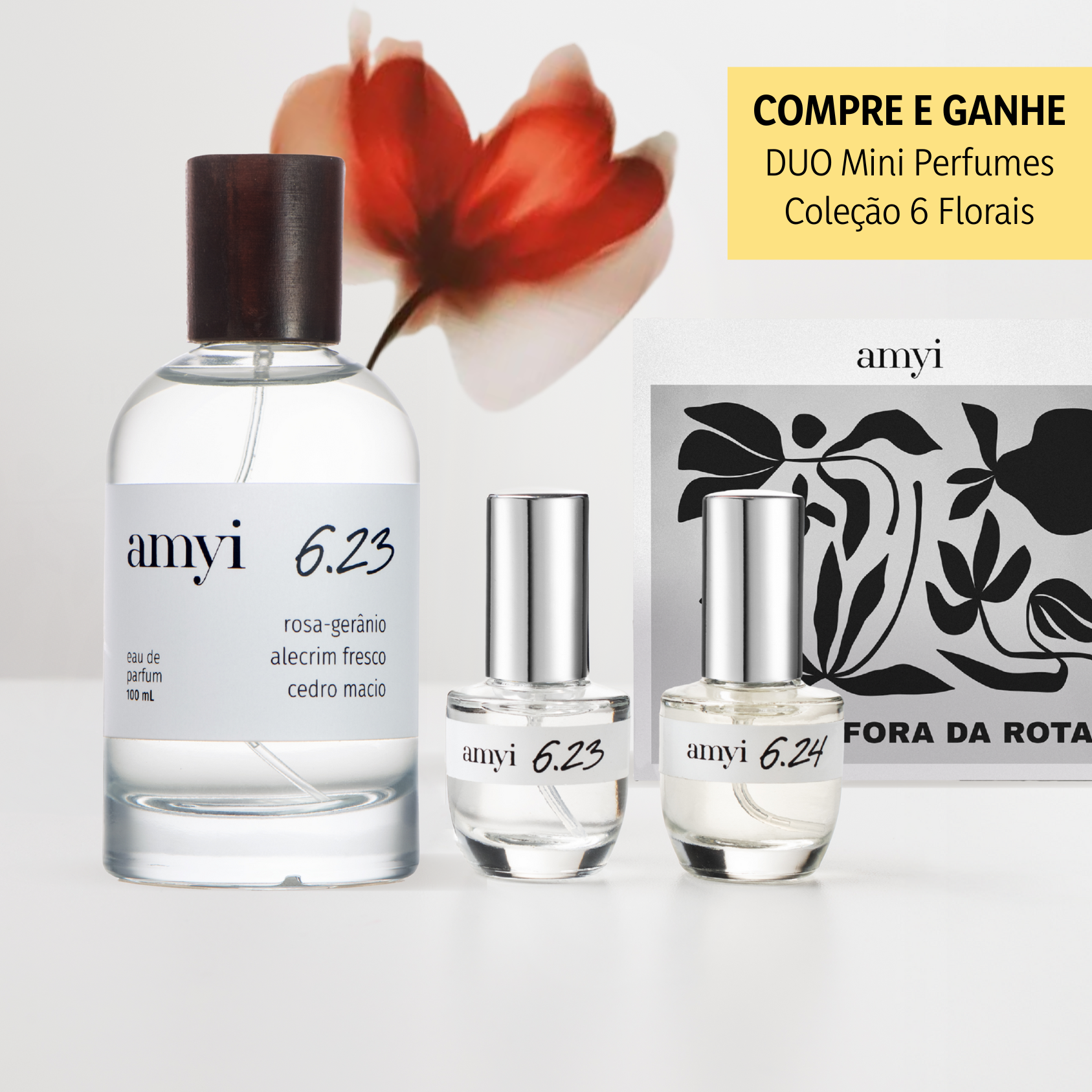 Amyi 6.23 é um perfume floral aromático que explora o frescor como caminho para uma nova leitura da rosa. Em seu coração, o encontro entre rosa damascena absoluta e gerânio dá origem a um acorde abstrato e instintivo: nem rosa, nem gerânio. Rosa-gerânio. Com saída refrescante de alecrim e menta, e fundo cremoso de cedro, âmbar e musgo, é uma fragrância urbana, fluida e envolvente.
